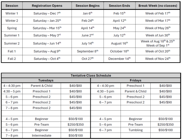 Sessions are 12 weeks long except for our spring session, which is 6 weeks.